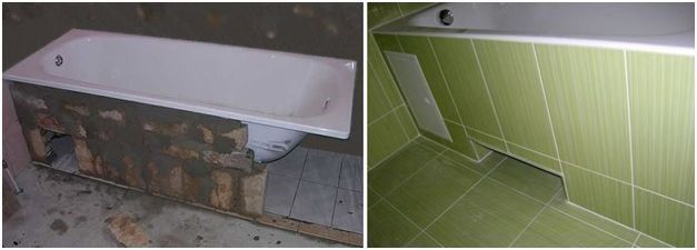 После этого на ней устраивается кирпичная перегородка с маленьким люком для доступа к сифону. Позже она обшивается плиткой.