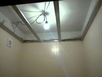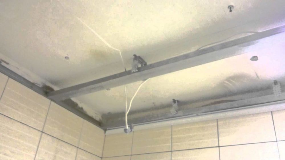 Такой вариант особо популярен, когда осуществляется отделка ванной в деревянном доме. Проще всего работа идёт с реечным потолком. Её стадии таковы: