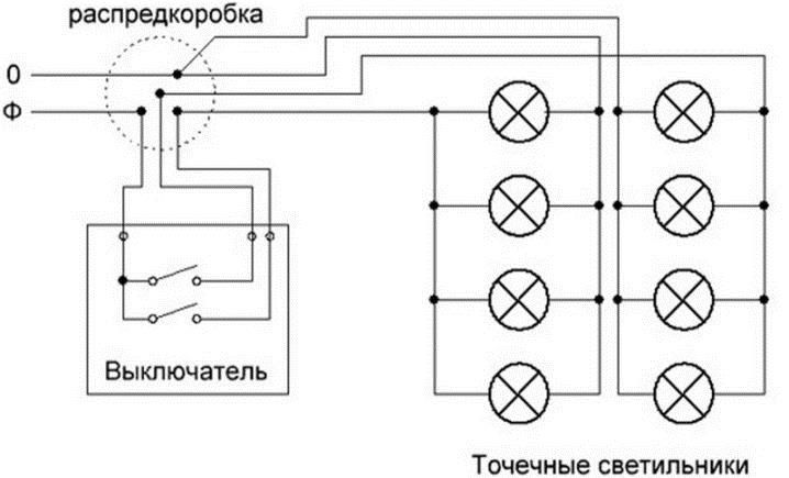 Как правило, в ванной немного световых приборов. Чаще всего один. При установке нескольких изделий тип разводки должен быть параллельный. Так, если сломается один прибор, другие продолжат работать.
