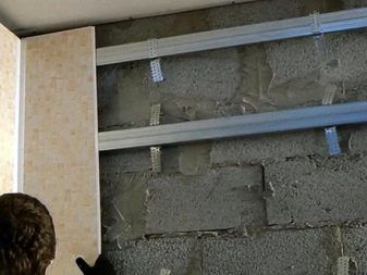 - Панели по одной помещаем в плинтус и присоединяем к обрешётке, используя саморезы.