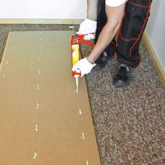 - Монтажа элементов на жидкий клей. Сразу фиксируются лишь три плинтуса. Четвёртый крепится после размещения полотен.