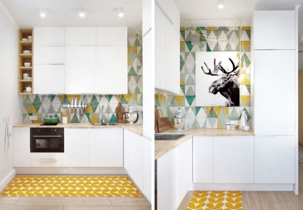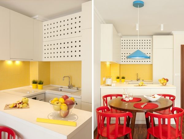 Здесь применено очень удачное решение по организации пространства в небольшой квартире – это кровать «на втором этаже». Это, безусловно, экономит пространство комнаты, позволяя на той же площади разместить и гостиную зону. Кухня в этой квартире является полноценным отдельным помещением, что может многим прийтись по вкусу.
