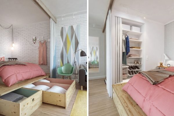 Штора выгодно отделяет спальную зону от гостиной