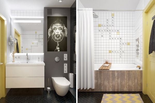 Контраст обстановки с напольной плиткой и подбор оснащения ванной комнаты