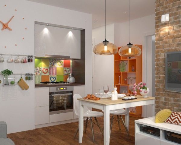 Это снова однокомнатная квартира-студия, которая позволила на небольшой площади с комфортом разместить кухню, обеденную зону и гостиную, а также выделить место под полноценную спальню. Светлые тона визуально увеличивают пространство, а сочные цвета отдельных элементов интерьера разбавляют общую концепцию и поднимают настроение.