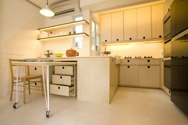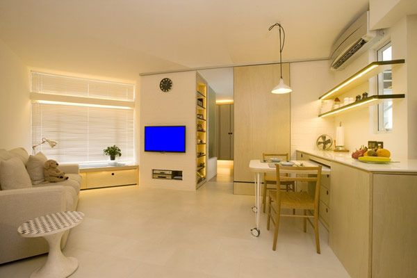 На самом деле все это поместилось на площади в 45 «квадратов». Устройство стеллажей за экраном позволяет оптимально использовать пространство, а обилие белого цвета создает ощущение дополнительного пространства. Кухня объединена со столовой и гостиной, однако при необходимости может быть закрыта сдвижной перегородкой. Зонирование в помещении гостиной осуществляется в основном расстановкой мебели и цветовым решением.