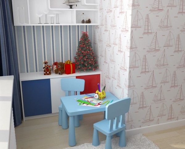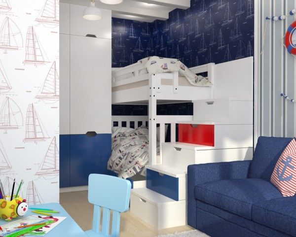 Естественно, площадь для детской придется забрать у гостиной и кухни, объединив их в одно пространство. Важно это сделать с сохранением комфорта, как в этом проекте. Уютная гостиная, рядом с которой расположилась обеденная зона и кухня с веселыми элементами. Детская же создана по морским мотивам и легко вместит двоих детей. Вот что значит настоящая оптимизация пространства!
