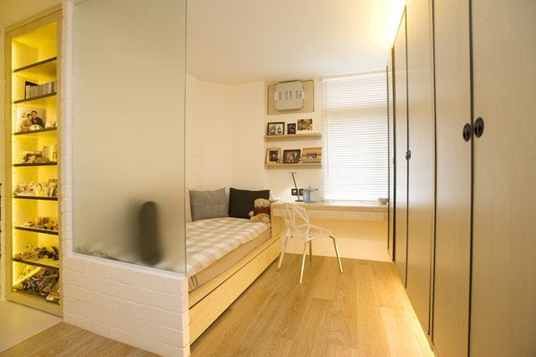 Зона детской отгорожена частично стеной, частично – стеллажом и полупрозрачной перегородкой и так же вмещает два спальных места, но теперь – на разных кроватях по обе стороны от входа в детскую. Вся стена комнаты отдана под вместительный шкаф. Организация света в этом проекте, несомненно, подарит ощущение тепла и уюта в любой самый пасмурный и холодный день.