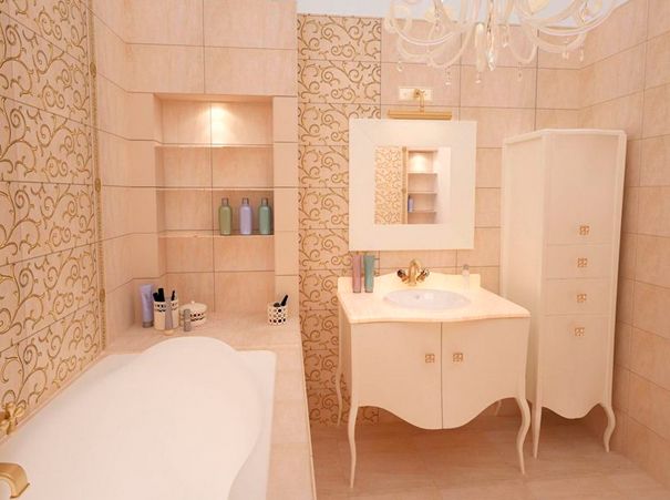 Классический стиль характеризуется скромной керамической плиткой в светлых тонах, сочетается она с декоративными панно или бордюрами. По своему опыту могу сказать, что получить такой интерьер можно за небольшие деньги. Достаточно много коллекций производители керамической плитки создают именно в «классике». Среди них есть бюджетные варианты, подходящие по цвету и фактуре. Главное найти подходящую сантехнику, светильники и мебель, придерживаясь единого стиля.