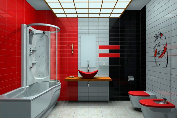 Ванная, оформленная в сочетании красного, белого и черного цветов