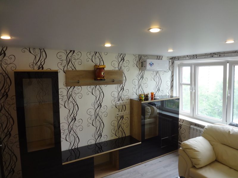 - Монтаж натяжного либо гипсокартонного потолка;