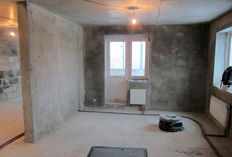 Если у вас 1-комнатная квартира в новостройке, то все поверхности должны быть очищены от любого рода загрязнений. Обратите внимание на фото ниже, на момент начала косметического ремонта все инженерные коммуникации (отопление, электричество, водопровод и пр.) должны быть проложены.